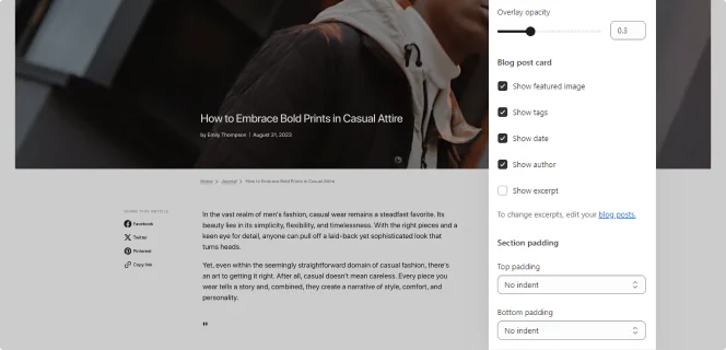 Customize overlays, section padding, and post cards to create a unique, personalized look for your blog.